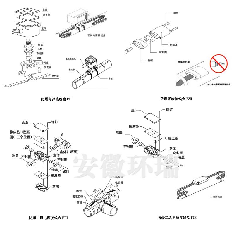 首端連接:電源接線盒,電源電纜鋪設(shè)到電伴熱現(xiàn)場(chǎng)后,通過(guò)電源接線盒與電伴熱帶連接。電源接線盒適用于危險(xiǎn)區(qū)域。 安裝時(shí),注意接線盒頂部電纜入口處的密封,以避免雨水進(jìn)入。