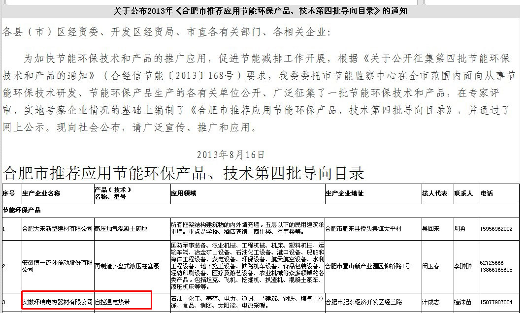 環(huán)瑞作為合肥經(jīng)濟(jì)科學(xué)建設(shè)道路上的重要成員,一直朝著“科技環(huán)瑞,電熱成就世界”的偉大藍(lán)圖邁進(jìn),其具有低電阻過渡層的自限溫電伴熱產(chǎn)品先后獲得省,市關(guān)于科技成果的榮譽(yù)有:合肥市科學(xué)技術(shù)獎(jiǎng),安徽省高新技術(shù)產(chǎn)品,合肥重點(diǎn)名牌產(chǎn)品。國家7項(xiàng)專利證書。其環(huán)保節(jié)能的特點(diǎn)已經(jīng)獲得政府、行業(yè)協(xié)會(huì),及市場(chǎng)的認(rèn)可。目前,環(huán)瑞公司已通過了合肥市推薦應(yīng)用節(jié)能環(huán)保產(chǎn)品、技術(shù)目錄的公示,獲得了環(huán)保節(jié)能產(chǎn)品稱號(hào),以下為合肥經(jīng)濟(jì)和貿(mào)易信息化委員會(huì)網(wǎng)站的公示內(nèi)容: