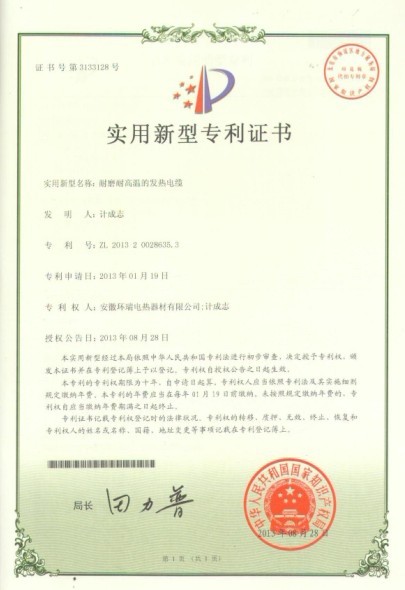 環(huán)瑞自成立研發(fā)小組至科學(xué)技術(shù)中心期間,通過獨立開發(fā),引進國外先進的生產(chǎn)工藝與技術(shù),與合肥工業(yè)大學(xué)建立長期合作關(guān)系,聘請相關(guān)專業(yè)的技術(shù)專家等模式,投入大量的人力物力。我司以安全,實用性能為目標(biāo),通過改變發(fā)熱電纜結(jié)構(gòu)與原材料,已研發(fā)成功。目前已獲得了關(guān)于畜牧養(yǎng)殖專用的國家專利證書,研發(fā)出耐高溫,耐磨的雙層絕緣的發(fā)熱電纜獲得了2項國家專利證書。包括之間我司獲得的“混凝土養(yǎng)護發(fā)熱電纜”“天溝融雪專用發(fā)熱電纜”,截止,我司已獲得了5項關(guān)于發(fā)熱電纜的國家專利證書,我司發(fā)熱電纜的生產(chǎn)技術(shù)已達到國內(nèi)先進。共計19項專利。新的專利證書已下達。