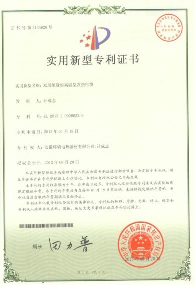 熱烈祝賀環(huán)瑞發(fā)熱電纜獲得三項國家專利證書