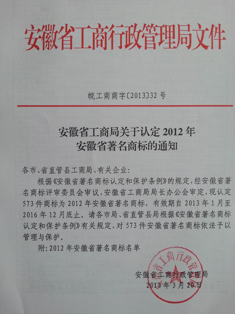 以下為安徽環瑞獲得著名商標政府紅頭文件