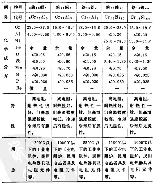 鐵路鋁和鉻鎳電熱合金的化學成分、特性和主要用途見表。