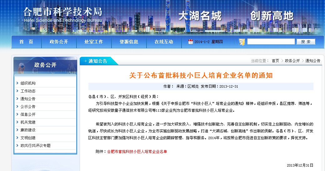 科技小巨人培育企業是針對有一定生產規模與研發能力,并且取得一定量的科研成果的企業。企業入選資格需經過經組織申報,縣區推薦、篩選等環節。安徽環瑞憑借多年電伴熱帶、發熱電纜生產技術研發獲得了市政府的重視,入選成功。以下為合肥科技局網通知公司內容: