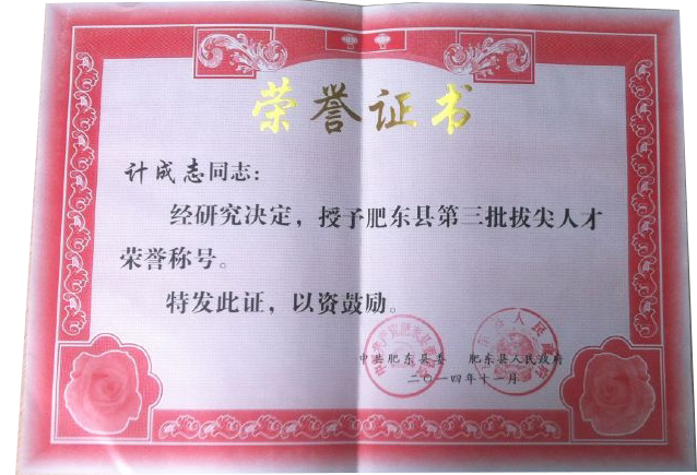 肥東縣委、縣政府為表彰環瑞公司對肥東縣當地經濟發展所作的貢獻,特授予環瑞董事長計成志“肥東縣第三批拔尖人才”榮譽稱號。