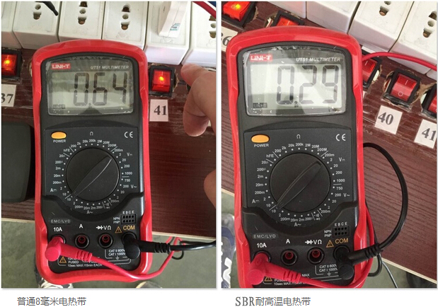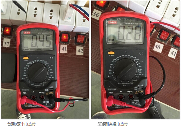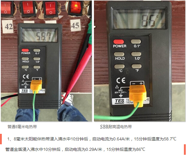 SBR型耐高溫電伴熱在模擬沸水管道狀態(tài)下使用后,啟動電流基本無變化,產(chǎn)品性能更加穩(wěn)定,有效地降低了伴熱帶起火燃燒的概率,提高了使用壽命,發(fā)熱溫度更高,更適合太陽能管道伴熱。